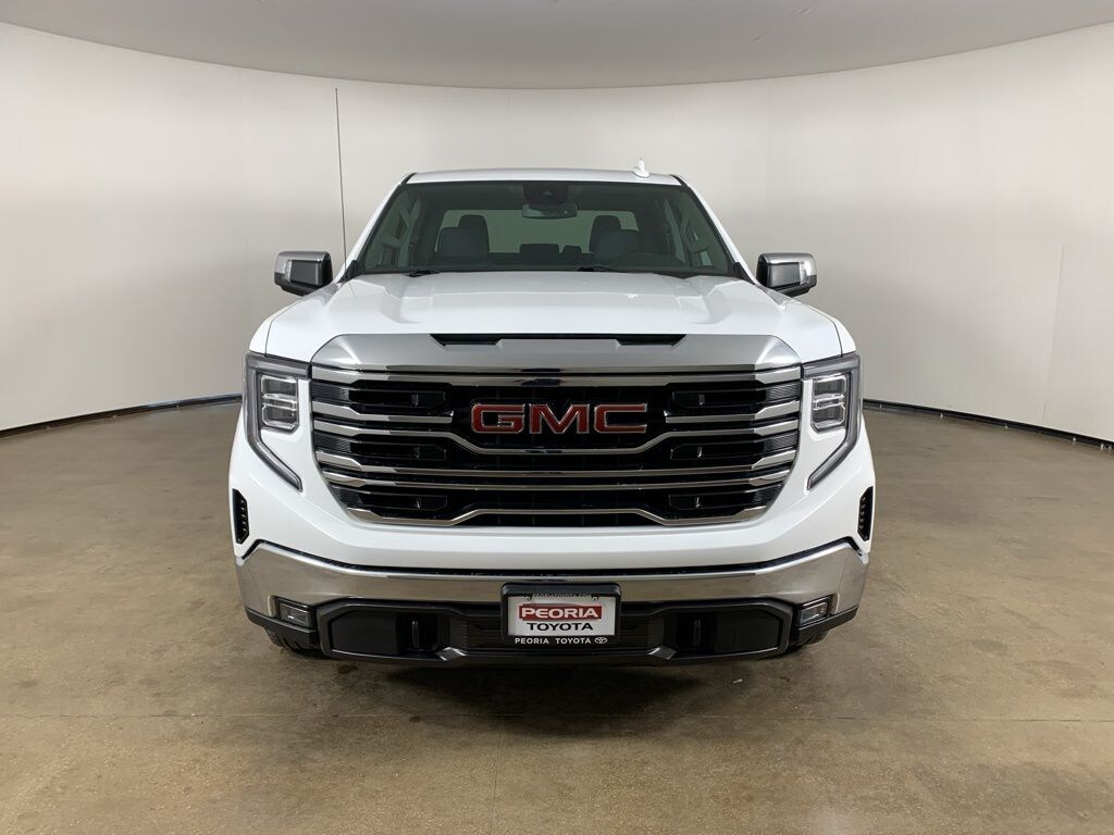 Summit White 2025 GMC Sierra 1500 SLT with Jet Black interior - available now at Peoria Toyota in Peoria, IL. This clean AutoCheck one-owner 2025 GMC Sierra 1500 SLT delivers bold V8 performance, advanced trailering capability, and premium comfort in a full-size 4WD pickup. Powered by the 5.3L EcoTec3 V8 and paired with a 10-speed automatic transmission, this Sierra is built to handle demanding workdays while offering refined technology and interior comfort for everyday driving in Central Illinois.
